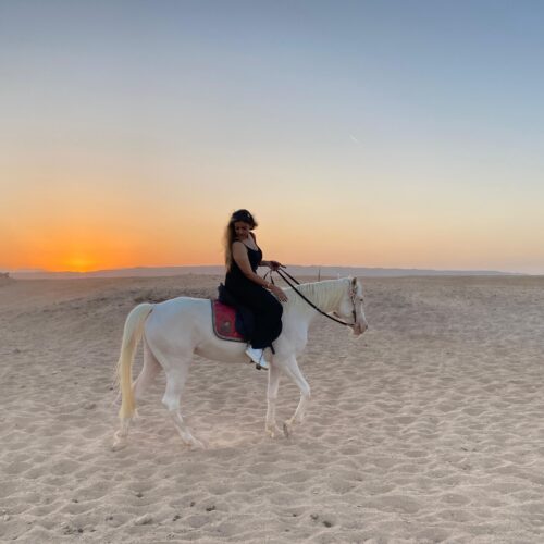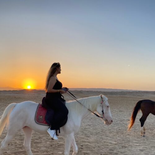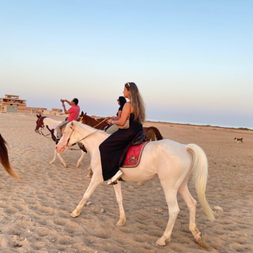 Spürt die Magie Ägyptens auf dem Rücken eines sanften arabischen Pferdes, während ihr durch goldene Sanddünen reitet oder entlang der glitzernden Küste des Roten Meeres galoppiert.